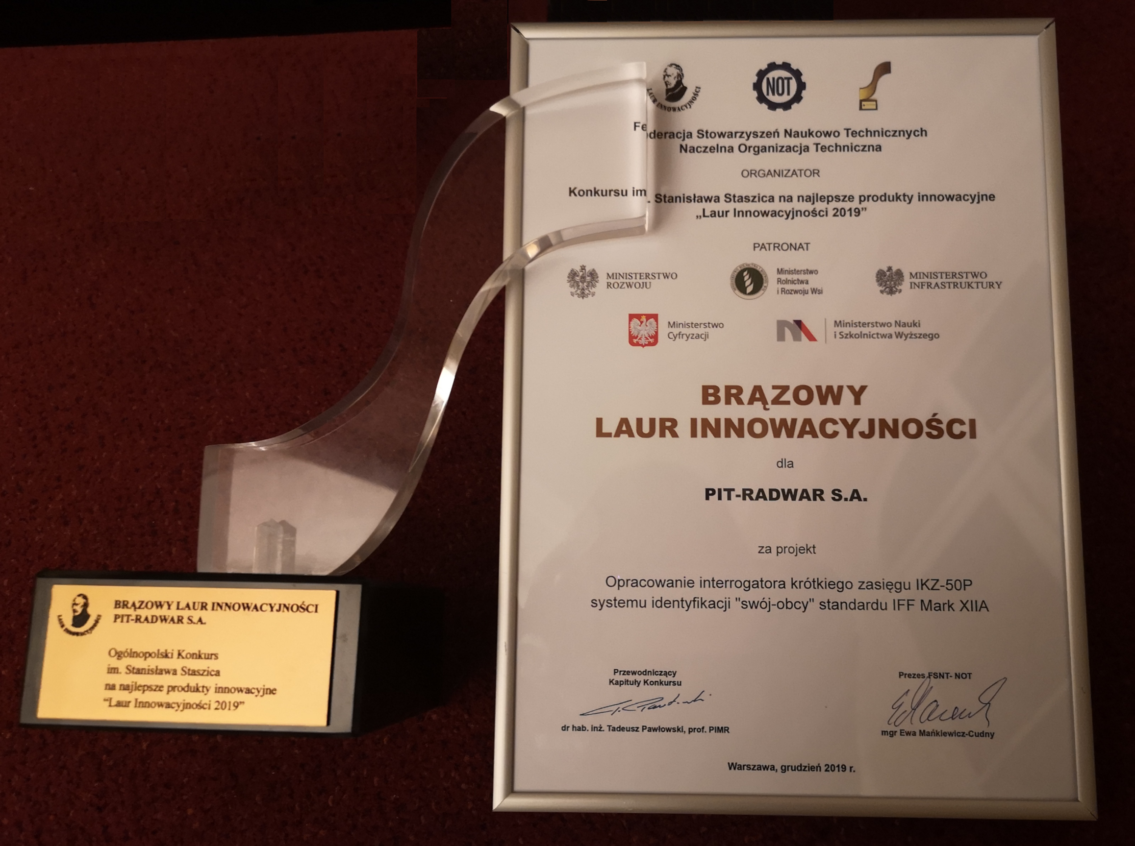 PIT-RADWAR S.A. otrzymał Brązowy Laur Innowacyjności w kategorii „Technika wojskowa” za urządzenie sytemu IFF Mark XIIA - Interrogator krótkiego zasięgu IKZ-50P. Nagrodę w imieniu Spółki odebrali Piotr Dyderski - Dyrektor Biura Systemów Radiolokacyjnych oraz Jerzy Miłosz - Dyrektor ds. Badań i Rozwoju PIT-RADWAR S.A.