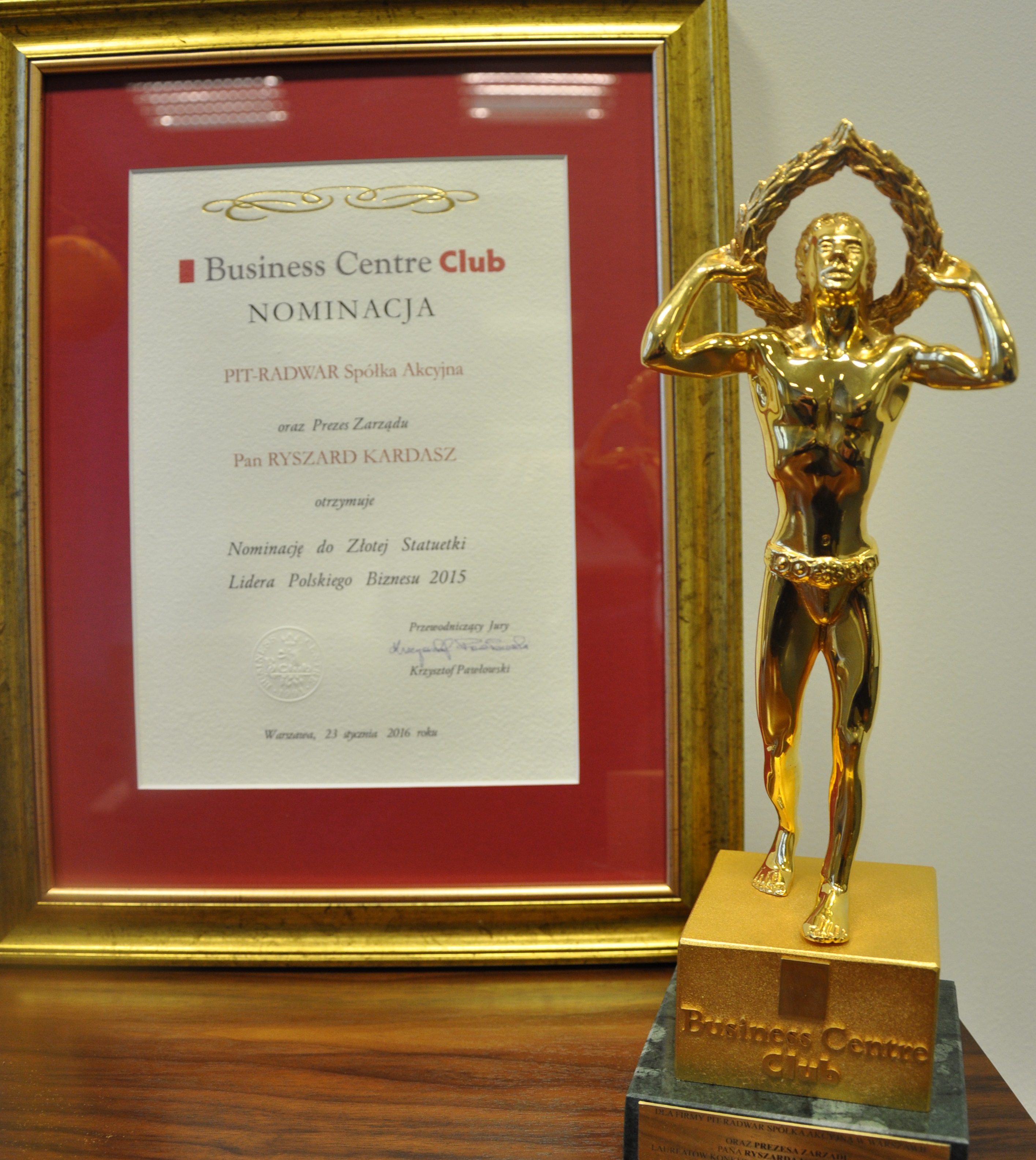 Firma PIT-RADWAR S.A. została laureatem konkursu Lider Polskiego Biznesu 2015. Ogłoszenie wyników kolejnej edycji konkursu Lider Polskiego Biznesu o nagrodę Złotej Statuetki, uznawanej przez przedsiębiorców za jedną z najbardziej prestiżowych nagród gospodarczych w Polsce miało miejsce podczas uroczystej Zimowej Gali w Teatrze Wielkim - Operze Narodowej w Warszawie w sobotę 23.02.2016 r.. Złotą Statuetkę wręczył Prezesowi Zarządu Spółki Ryszardowi Kardaszowi - Wicepremier i Minister Rozwoju Mateusz Morawiecki Tytuł został przyznany firmie za wyniki finansowe, dostarczanie innowacyjnych rozwiązań, kompleksowość i niezawodność proponowanych usług, najwyższą jakość produktów oraz dbałość o środowisko naturalne. Podczas sobotniej gali Business Centre Club tytułami Liderów Polskiego Biznesu uhonorowano 16 firm. Nagrodę specjalną otrzymał ks. Adam Boniecki, redaktor-senior "Tygodnika Powszechnego". Złote Statuetki w konkursie "Lider Polskiego Biznesu" przyznawane są przez Business Centre Club od 1991 roku. BCC przyznaje je firmom i ich szefom, którzy w swej działalności kierują się nie tylko zyskiem, ale i etyką prowadzenia biznesu oraz troską o sprawy państwowe. W tegorocznej uroczystości, wśród blisko dwóch tysięcy gości, obok przedsiębiorców z całej Polski wzięli udział także m.in. parlamentarzyści, dyplomaci, przedstawiciele świata kultury i nauki oraz znani publicyści.