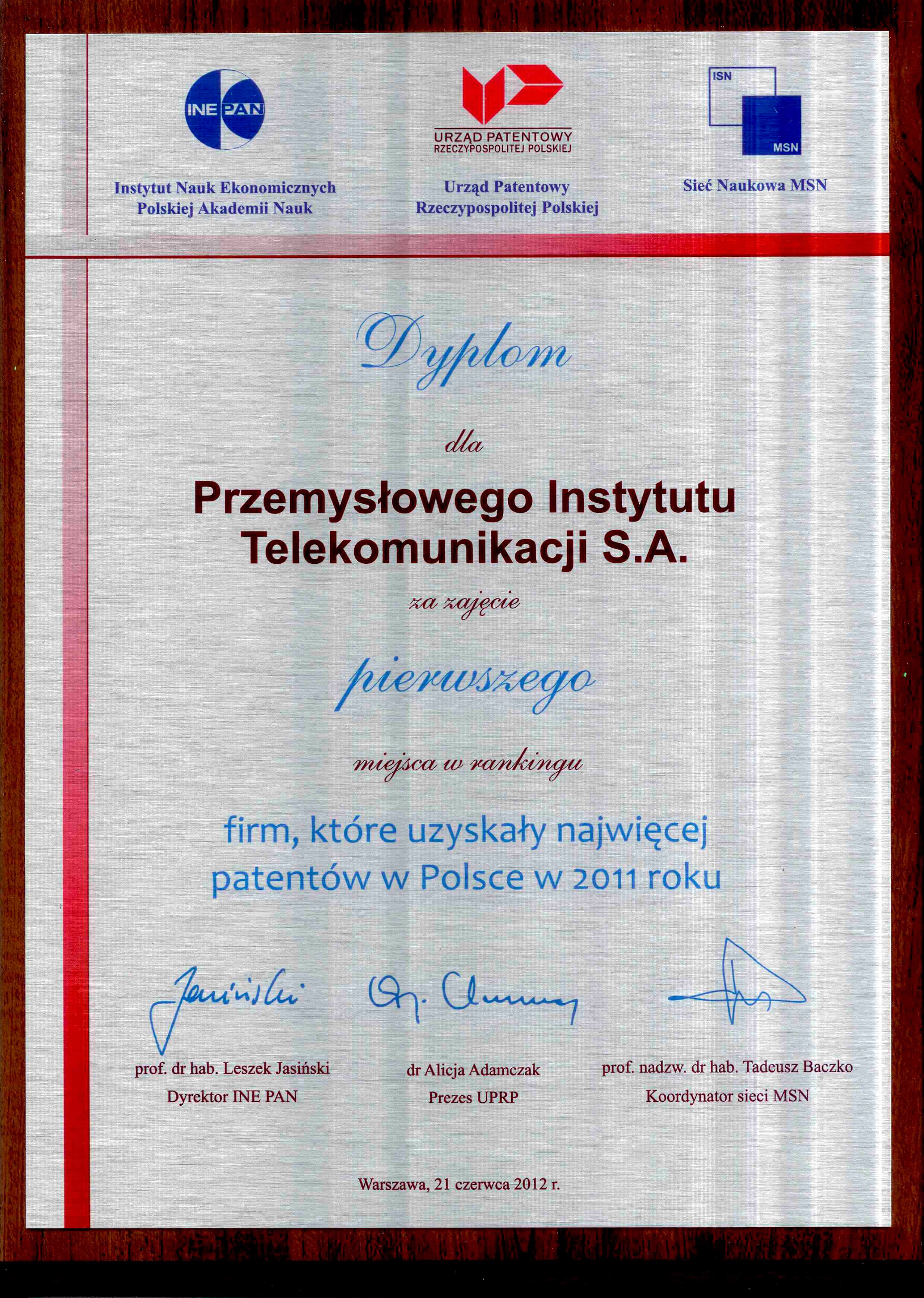 Przemysłowy Instytut Telekomunikacji S.A.(obecnie Bumar Elektronika S.A.) uzyskał najwięcej patentów w Polsce w 2011 roku